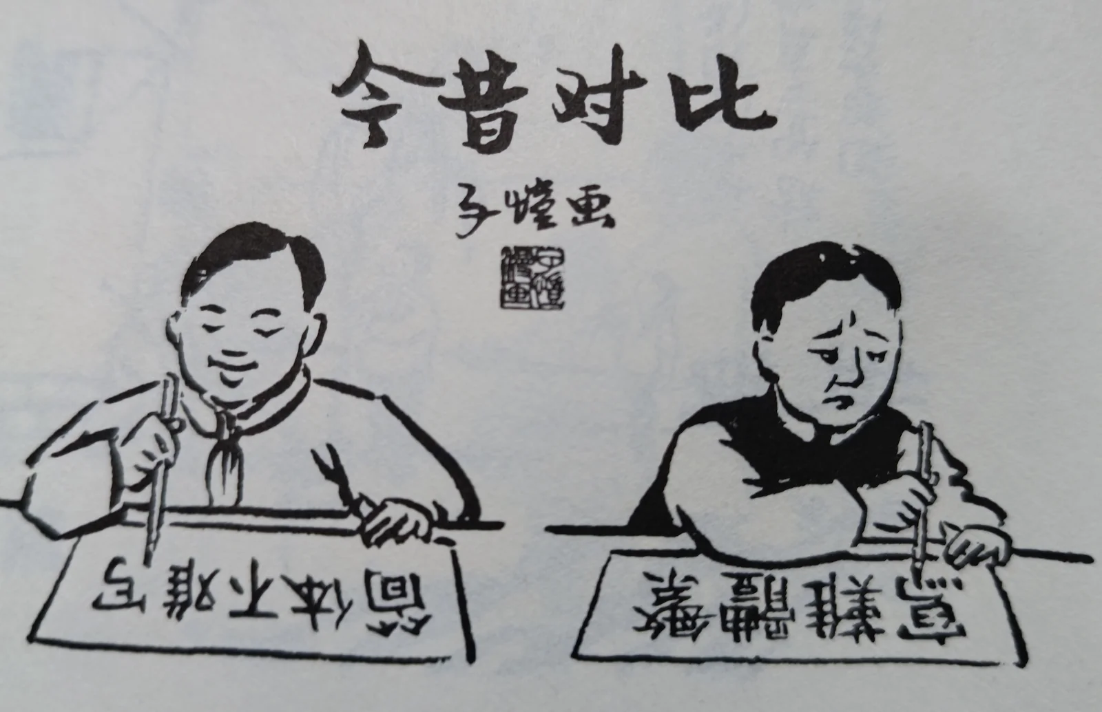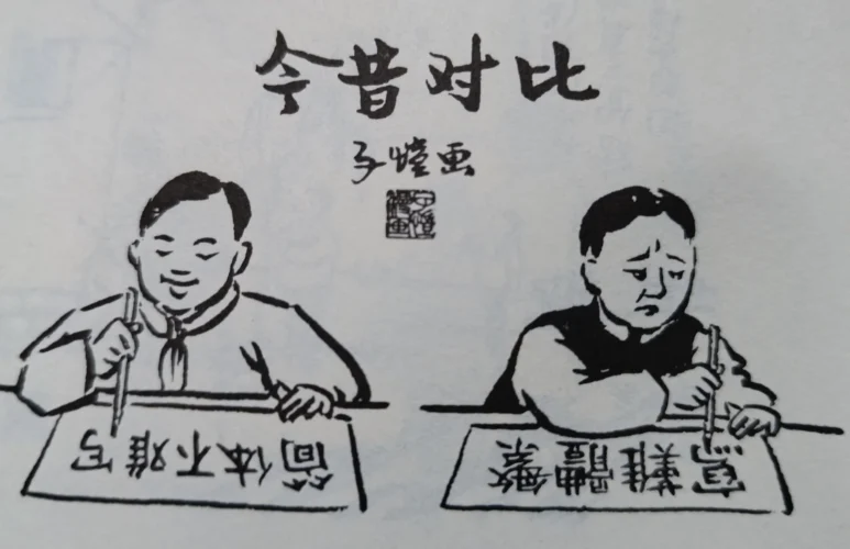 На рисунке написано «Сравнение прошлого и настоящего (今昔对比), рисунок Цзыкая (子恺画)» (Источник: Feng Zikai 20102: 30)
