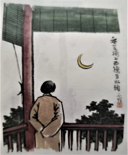 На рисунке написано «Молча один стою на Западной башне, Луна подобна крючку» (Источник: Feng Zikai 2013: 131)
