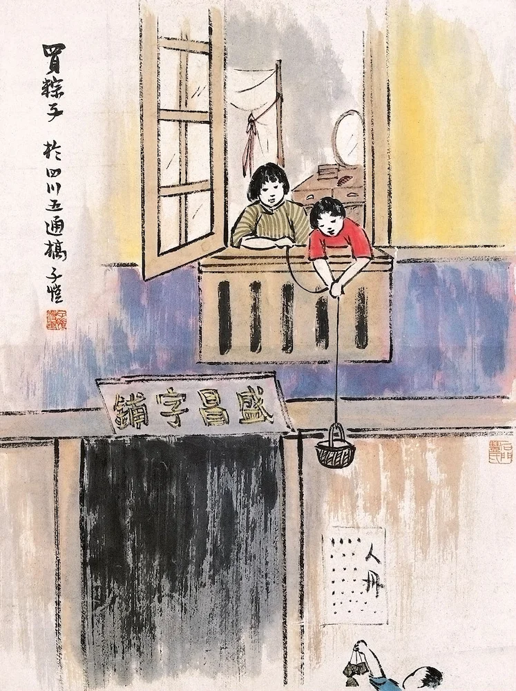 На рисунке написано: «Покупка цзунцзы; у моста Утун в провинции Сычуань, лавка Роскошь» (Источник: Feng Zikai manhua)