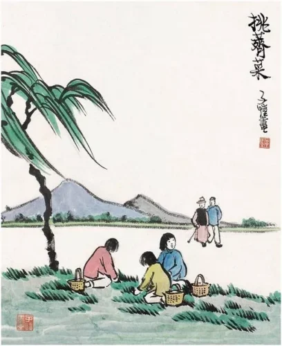 На рисунке написано: «Сбор пастушьей сумки; рисунок Цзыкая» (Источник: Feng Zikai manhua)