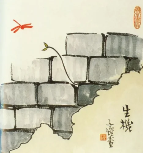Иногда я смотрю на эти работы и нахожу их жуткими, пугающими, ошеломляющими. Внезапно я осознал, что способом «осуждать ложь» нельзя злоупотреблять и применять его слишком много, иначе это приведёт к потере сострадания, и работы утратят силу своего воздействия. Итак, я подумал, что искусство, в конце концов, прекрасно, жизнь – великая ценность, а природа величественна. Эти же мои горестные и печальные работы на самом деле не нормальное искусство, а временное приспособление к обстоятельствам. Древние говорили: «У поэта злого века не найдётся добрых слов» (“恶岁诗人无好语”). Я теперь как раз художник злого века, но мои глаза также должны от злого века обратиться к вечности, и мои кисть и перо с таким же успехом могут обратиться от жизни людей к природе и искать более глубокие живописные сюжеты и содержание. Я вдруг заметил маленькую травинку, пробившуюся из кирпичной щели в разрушенной стене, и нарисовал «Силу жизни» (《生机》).
